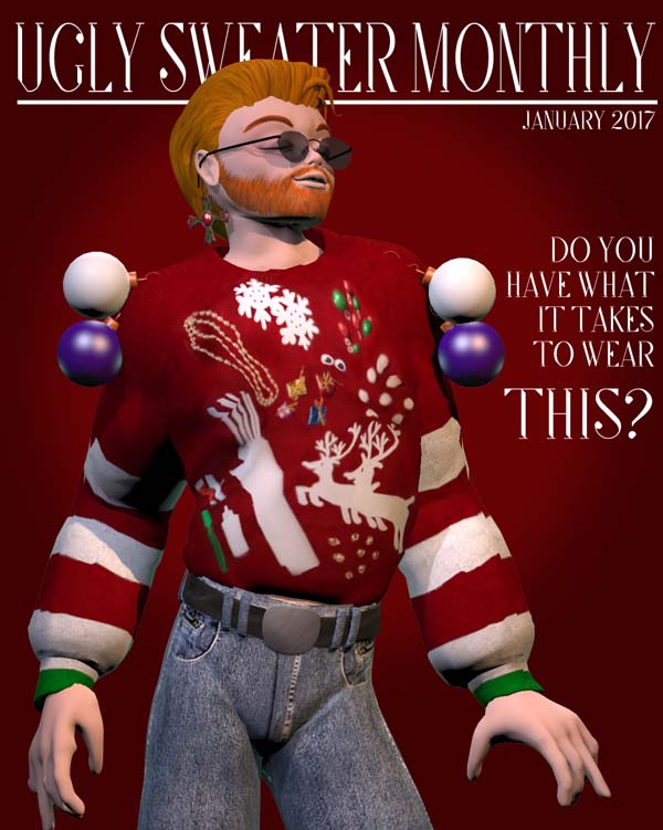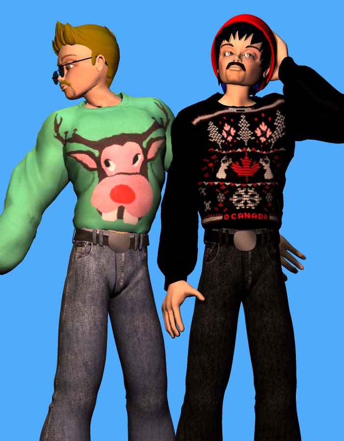 So the guys will be acting as a sort of prize for the Ugly Holiday Sweater contest at PanHistoria (www.panhistoria.com), wherein the three top best (and by that we mean worst) entries will be transformed into 3D designs and modeled on our ever lovely cast of gay Canadians and gay Americans and gay Europeans. It’s gonna be fun — and yes I’ll be showing the final winners, probably as part of the regular cartoon strip.