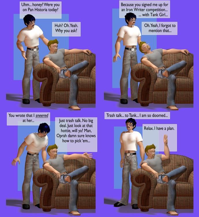 So every so often over at http://www.panhistoria.com, they hold a little contest called Iron Writer. Modeled after “Iron Chef”, two contestamts have 24 hours to write five stories in different genres, all around a singular theme of some kind decided on the day.