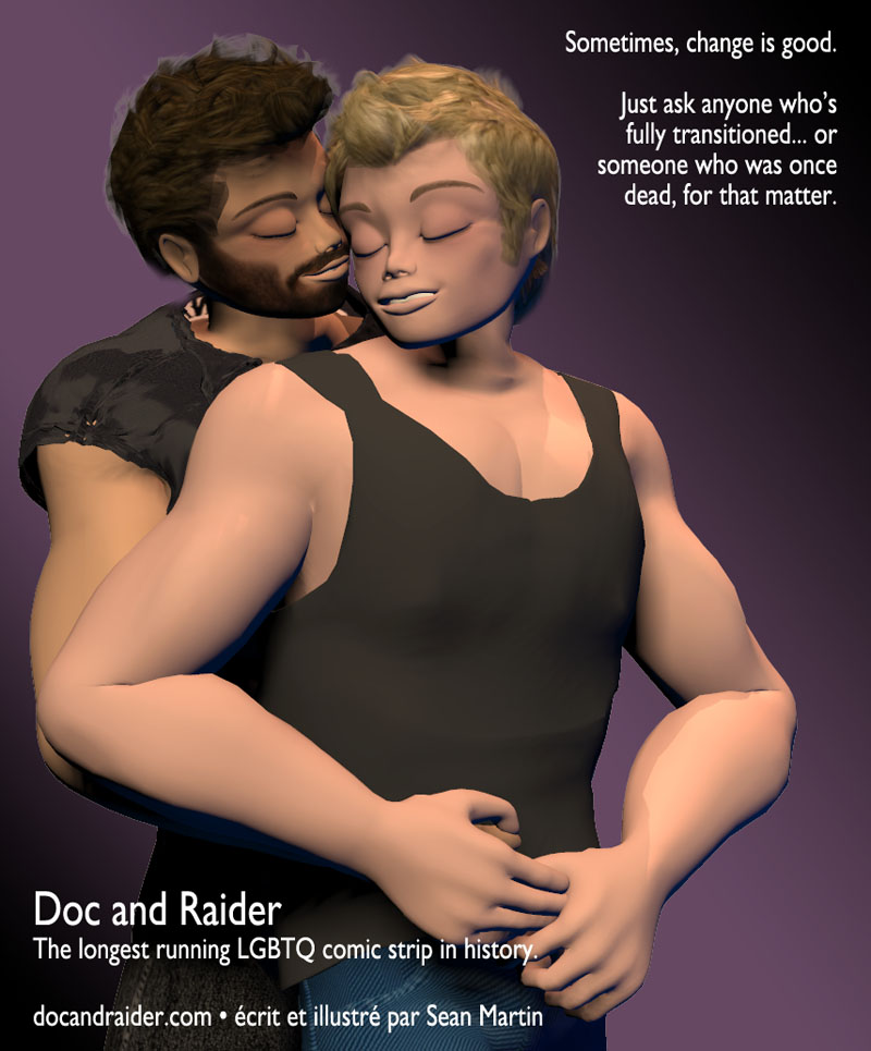 After so many years, the Doc and Raider Universe is getting almost as dense as a Russian novel, with characters whose backstories are intricate and complex. Take these two. Aiko is a fully-transitioned FTM transsexual, but someone whose transition was provided by… well, divine intervention… while Louis is a young Italian who died during WW1, spent decades in the Afterlife, and was revived… by divine intervention… to become Aiko’s main squeeze.