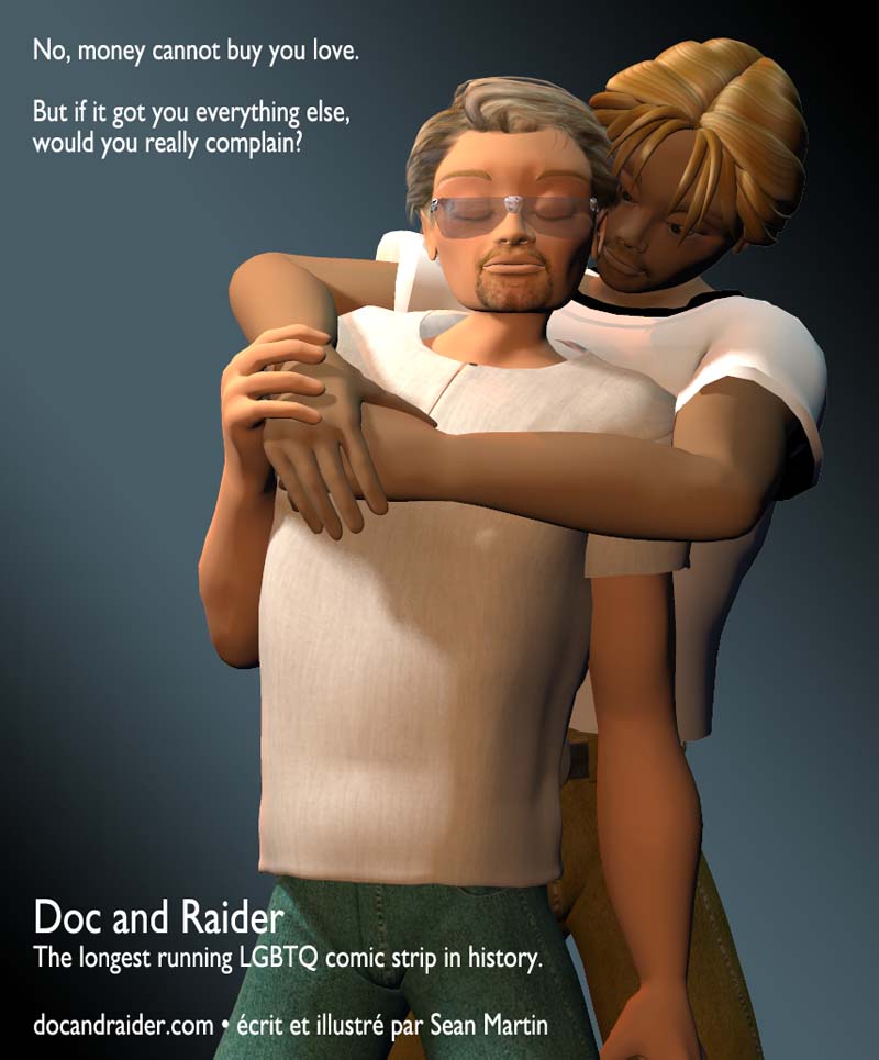 In his past, Eddie was a dissolute dilettante, with a fondness for rent boys because it made relationships simple. André was a day labourer who knew nothing about the Bartholomew fortune, just that Eddie was this slightly cynical yet endearing guy whose sensibilities matched his own. In order to keep seeing this man he was starting to fall in love with, André assumed the role of a hooker, even though he never took the cash Eddie laid out after their encounters, for two reasons. First, it made Eddie happy to think he was dating a hooker, which made André happy. Second, as he put it when André revealed himself, “Eddie, if your friends all knew you had a day labourer for a boyfriend, they’d say I was there only for your money, which would make them doubt your business sense. But if you tell them I’m a hooker, you can laugh in their faces and say of course that’s why I’m there.”