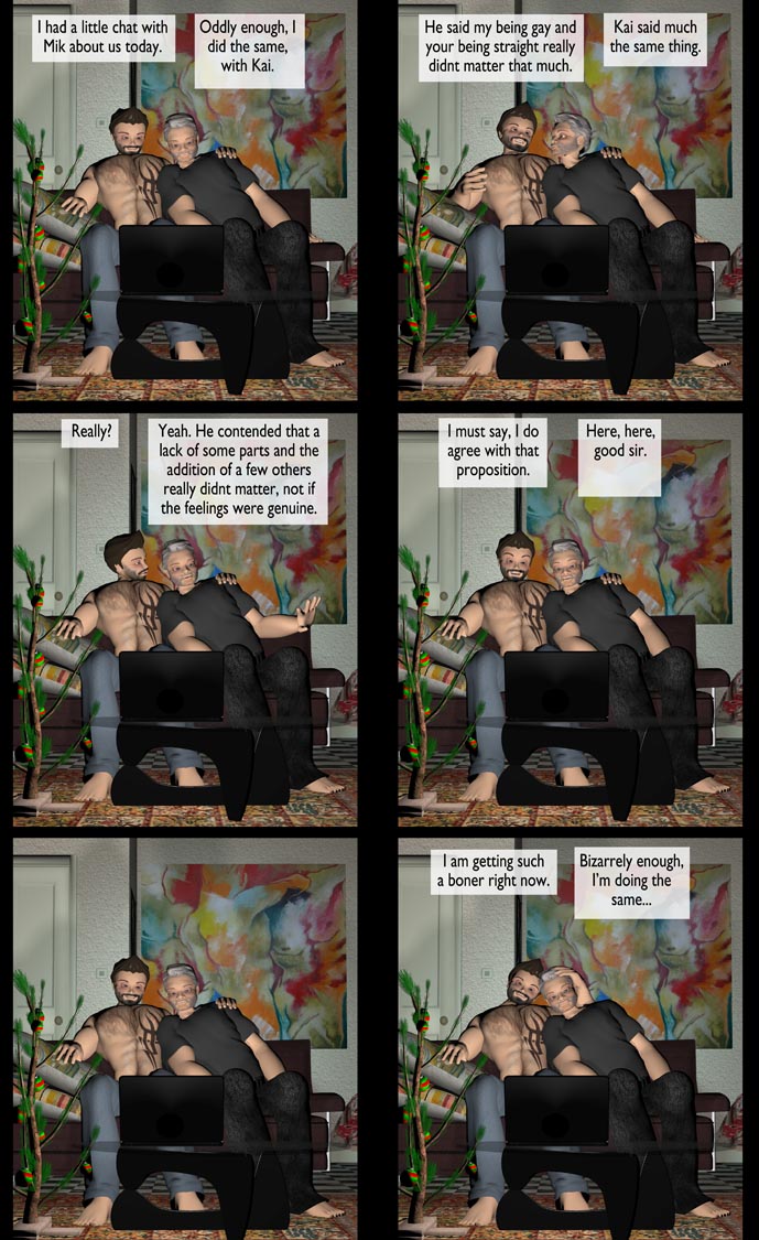 As always, I’m extremely enjoying your storytelling. I do have to admit, I was kinda saddened to see Frank “go for it” as it were. It just kinda plays into the whole “converting the straight guy” fantasy. That said, it doesn’t diminish in the least my enjoyment of this storyline! And, like many others, I cannot wait to see what happens next!