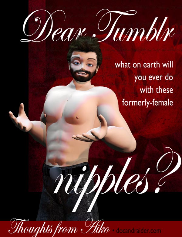 I posted the above on my Tumblr feed. Thoughts from Aiko is a semi-regular feature of the cartoon, featuring the occasional musings of the sardonic FTM transsexual Aiko. I’m gonna leave it for about a week, then I’m pulling the entire page down. At this point, it’s simply not worth it. But it does raise a rather interesting question: