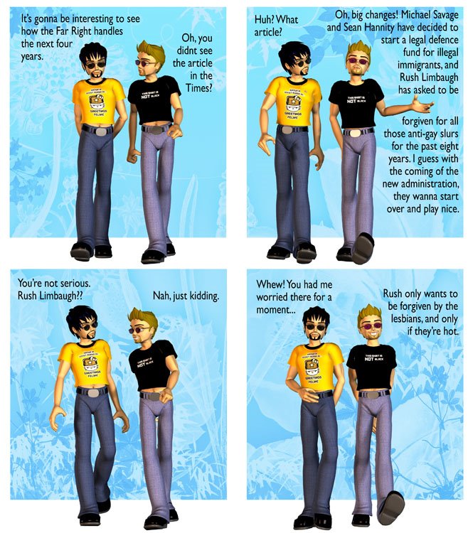 For those not familiar with the strip, DNR started as a hand-drawn comic back in the mid80s in Canada and had a pretty successful run for almost a decade: two anthologies, about 3.5 million readers worldwide, and raising some pretty serious bucks for everything from an AIDS hospice in New Zealand to an arts festival in Scotland. I let the strip go fallow for a number of years, then brought it out of retirement a couple of years ago when the opportunity arose to convert the guys into 3D versions of themselves. This format is also allowing me to explore animating the guys; that should be a lot of fun.