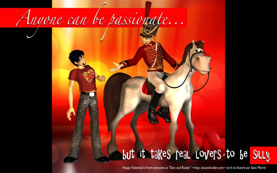 I’ve just about wrapped up work on the “How to Have a Perfect Valentine’s” pdf I promised, so look for that soonest. In the interim, pop this into your honey’s wallpaper… and then follow through with your own brand of silliness. Click through for a 1280×800 version.