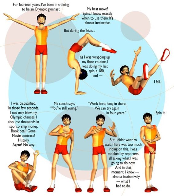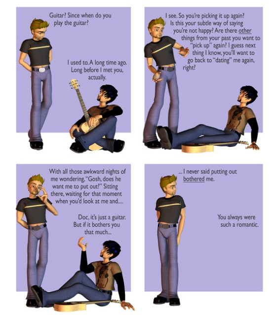 If nothing else, it’s interesting (to me, anyway) how the style has evolved since this re-boot started last October. “Guitar” is from November, when I was still using a fairly classical layout, with rigidly defined borders. I was also pursuing using Doc and Raid playing other characters (like the gymnast seen here and the previously-blogged “black-and-white man”) in something akin to sketch comedy, but that was starting to get a bit too confusing, even for me.