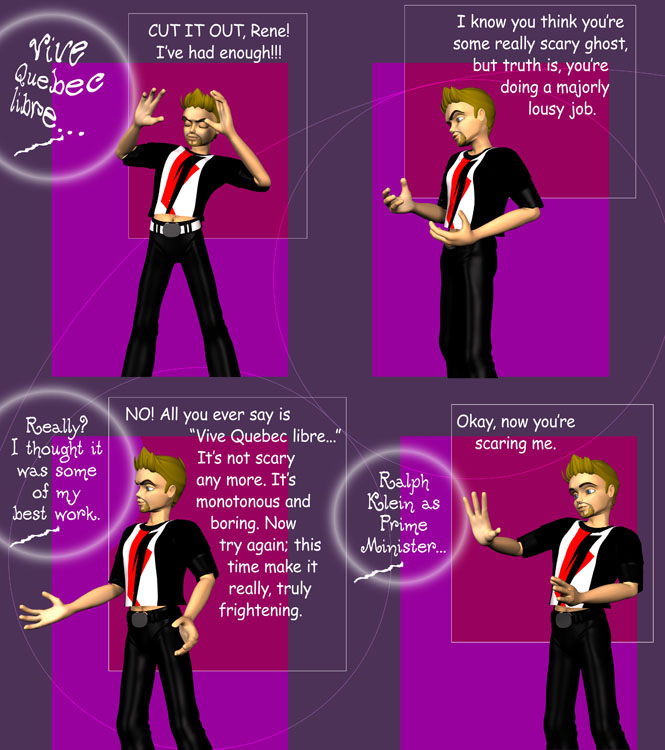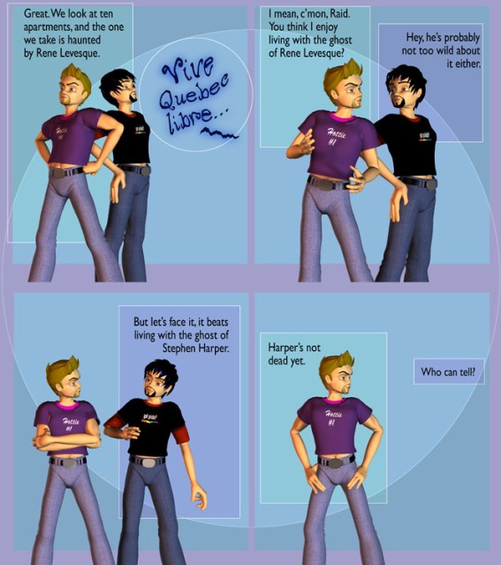 The boys are indeed Canadian, in case there might be any doubt sometimes. These strips, initially done about a year ago, have been re-formatted and are included here to keep the blog’s collection complete. Just FYI for my non-Canadian friends, René Lévesque was premier of Québec from 1975 to 1986 and laboured unceasingly to make that province a separate, French-speaking country. The movement has had its ebbs and flows over the decades since, but I think most Québecers have come to the realization that the ROC (rest of Canada) would miss them dearly if they ever left.
