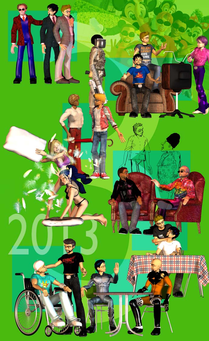 2013 brought us the boys hauled before a Senate Investigative Committee and caught between advocates of both the First and Second Amendments. Eddie made a last-ditch effort for André with a date on the cheap, while Aiko wandered a world where everything is reduced to simple black and white points of view. We met the Heathers, as Al is made Temporary Pope by the Gay Vatican Mafia. Ray took his hand at cooking Thanksgiving Dinner while Doc acted as mediator between two warring superheroes with a secret crush… on each other, and Elliot had to confront the limitations of parenthood when Gilles and their son Raymond-François were involved in a near-fatal car accident.