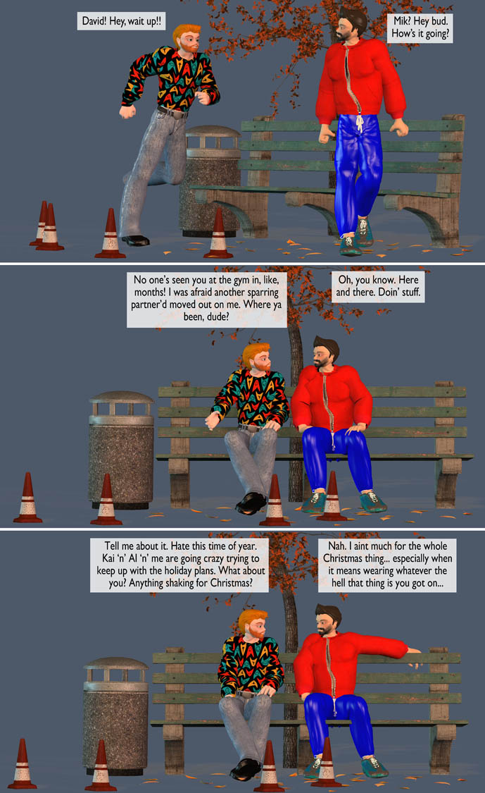 Okay, for those just joining us and those who might not remember, David is Mik’s sparring partner now that Raider has moved back to Canada. David is also Mik’s fling on the side, something Al and Kai know about and have given their blessing to.