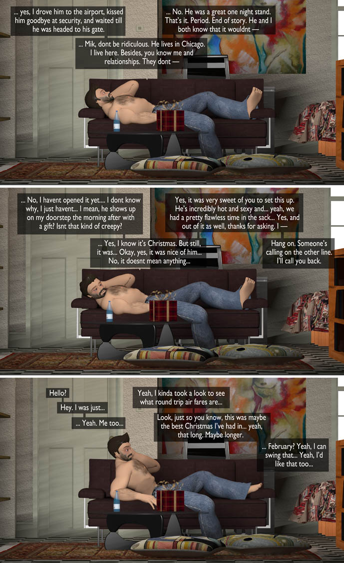 Yeah, kind of a low-key Christmas story this year, but the times seemed to ask for it. And David — everyone’s favourite fuckbuddy — has been kinda languishing in need of a storyline, so… Originally, this was going to be much weirder, by the way: Noel was actually going to be an elf — but somehow it just didnt feel right, not for a couple of lonely people just trying to get past the holiday in one piece. Will anything come of it? I guess we’ll see in a couple of months.