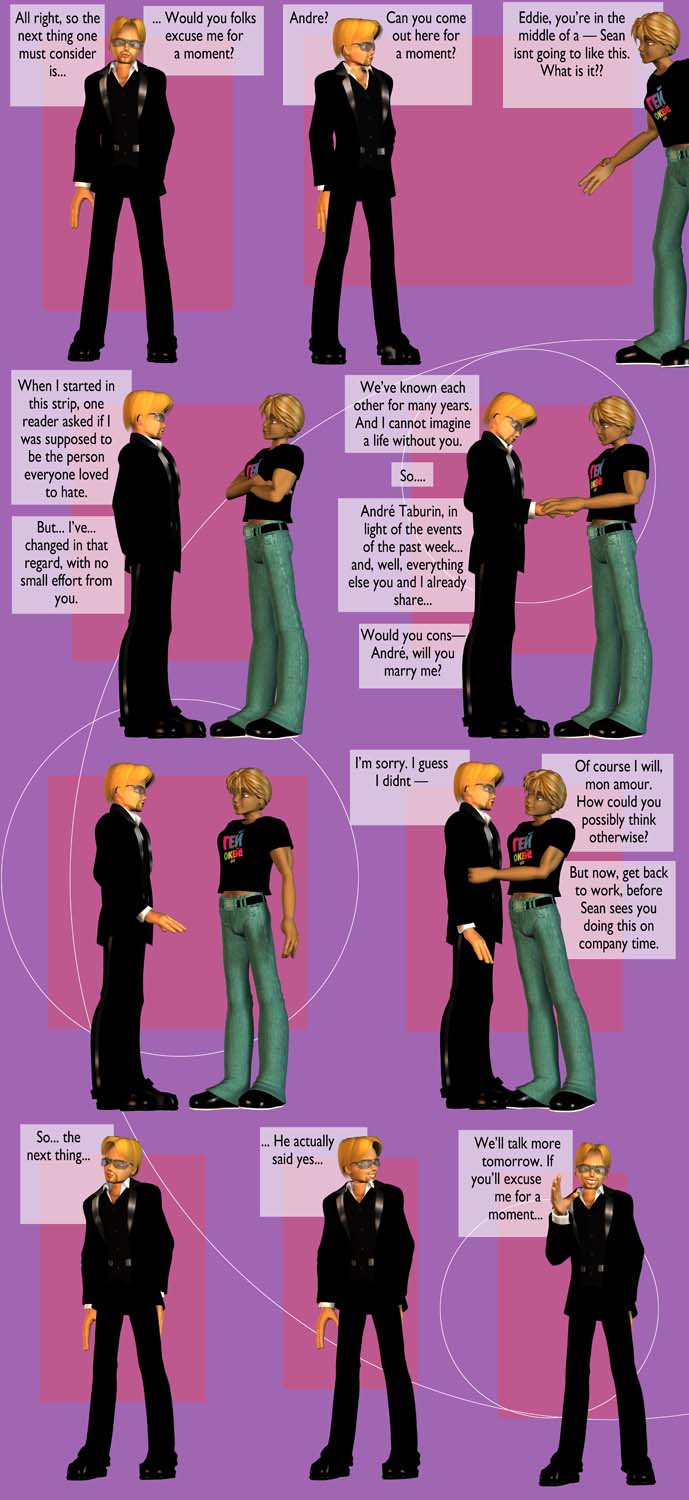 But if you remember anything from this little comic of mine, remember what happened right here, between Eddoe and André — who are no different from the countless other couples out there. All they want is a little bit of personal happiness and personal respect and personal dignity. That’s all. Everything else is just so much… stuff.