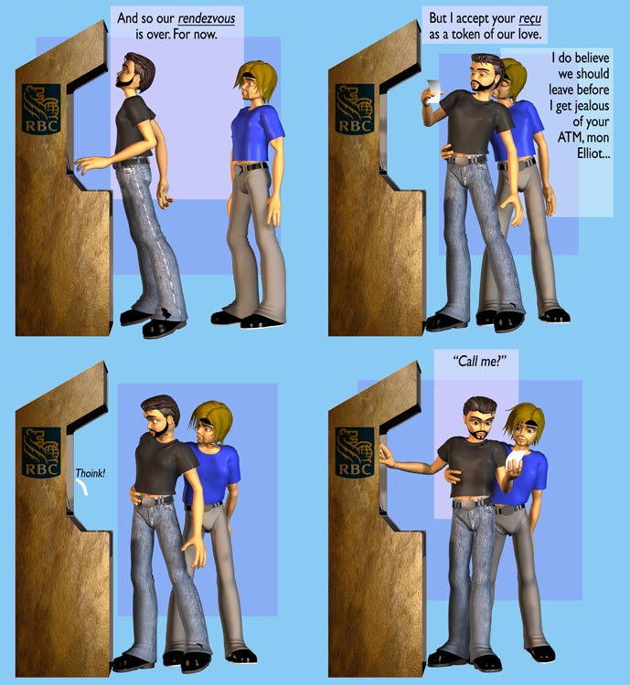 To be honest, I waffled between the two and finally decided there was something more surreally poignant about an ATM craving affection after a one-transaction stand. They both work, in their own way.But thanks for the comment, bud!