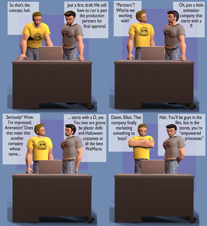 Well, that’s still up to you, dear Reader. Today is the last day you can get in your entry to tell Doc what he’s writing for this. The fact that P and D are involved does not in any way restrict you, by the way. If that D company thought it could make money off an all-nude-male version of Anna Karenina, it’d very likely throw money at it. So give this thing your best shot.