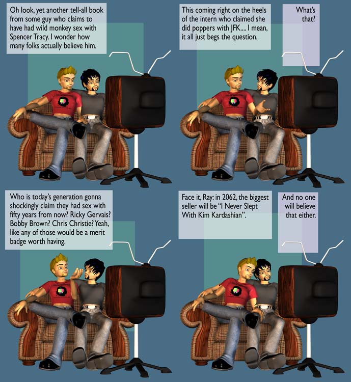 1. If you’re referring to Scotty Bowers’ memoirs, you’ll be glad to know that I received an e-mail from the Toronto Public Library yesterday that my request has already been fulfilled, and it’s waiting for my at my local branch, just around the corner. Theres nothing like curling up with a good book… or someone who’s read one. FIlm at eleven!