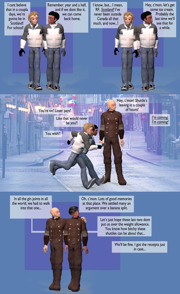 In a small way, I do feel a bit sorry for those who come to this strip for the first time and are utterly perplexed by what’s going on. But then again, there’s decades of backstory now, and one of the things I mentioned during the recent convention in Detroit is that this thing builds organically: storylines happen as a result of other storylines and other characters. So Jérôme and RF’s move to Scotland for school precipitates… well, you’ll see. Enjoy. I have no idea where this is going to go, but we’ll have fun along the way…..