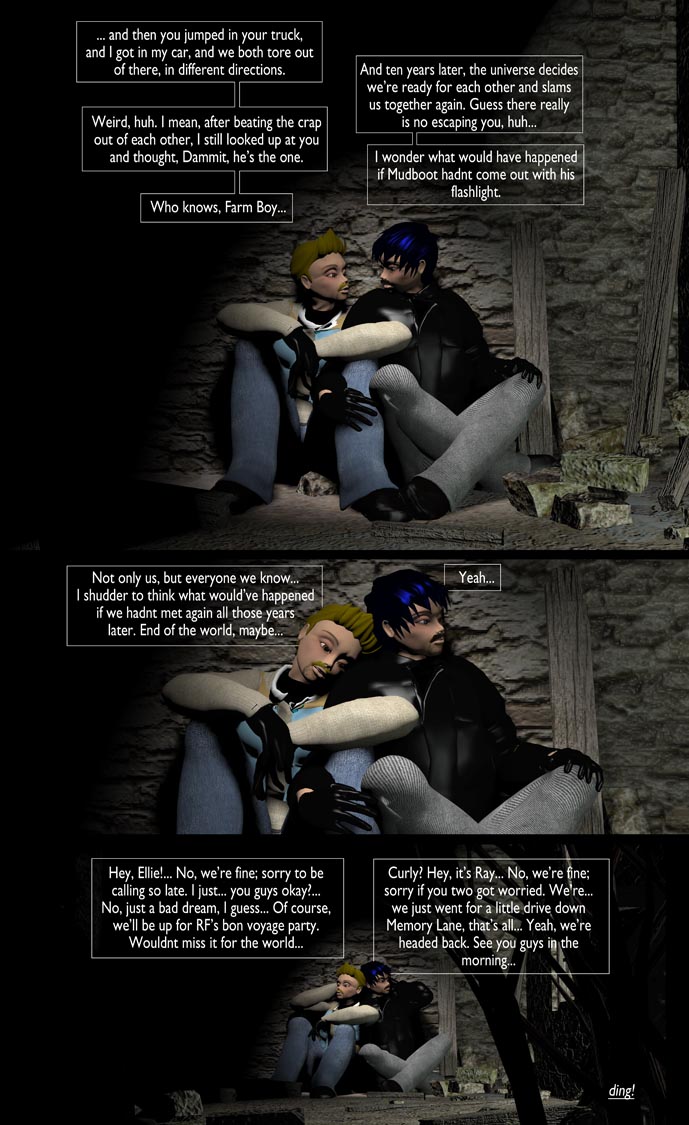 This is the resolution of a storyline that’s been left open since March of 2014, when the guys first realized they’d encountered each other before meeting up again in a bar in Toronto ten years later. And the question was always left unanswered: what happened that night in the parking lot at Mudfoot’s? The guys didnt remember, so I guess we had to go back to find out, and now we know.