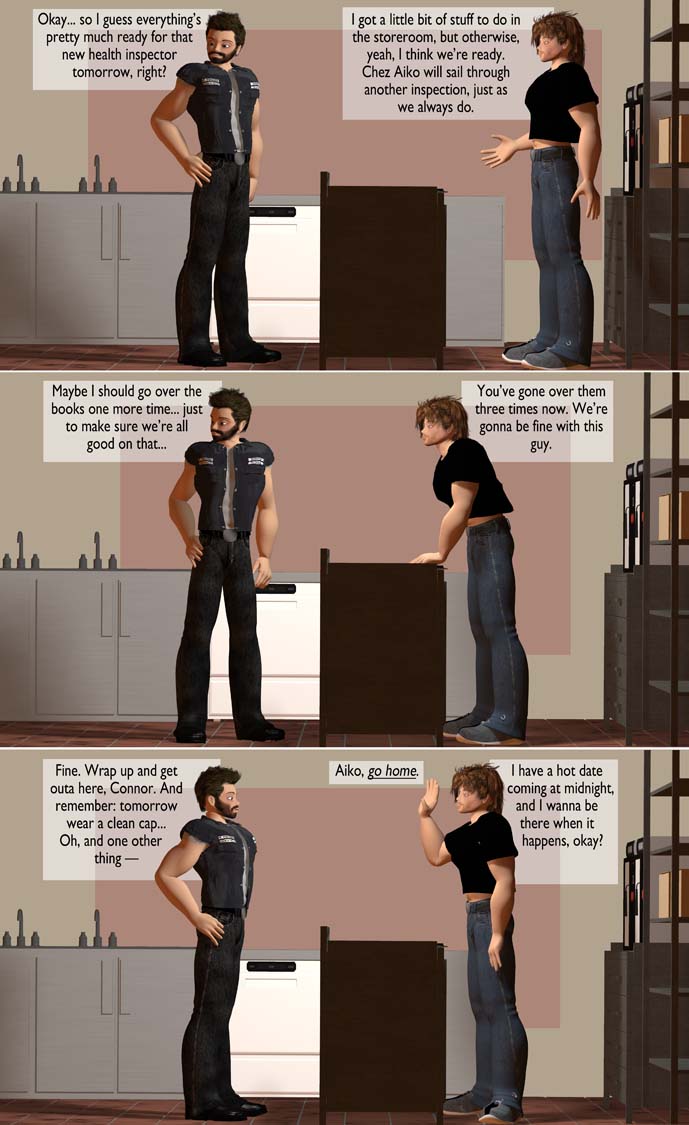 If you’re just joining us, a little catch-up: Aiko was an FTM transsexual who, through a series of events too complicated to reprise here, suddenly found himself fully male as he’d always wanted (You’ll see a little bit of how that happened later in this storyline.). He’s living with his boyfriend Louis, whom he met when… well, again, you’ll see as things progress. If you’re curious, you can read the previous story starting here.
