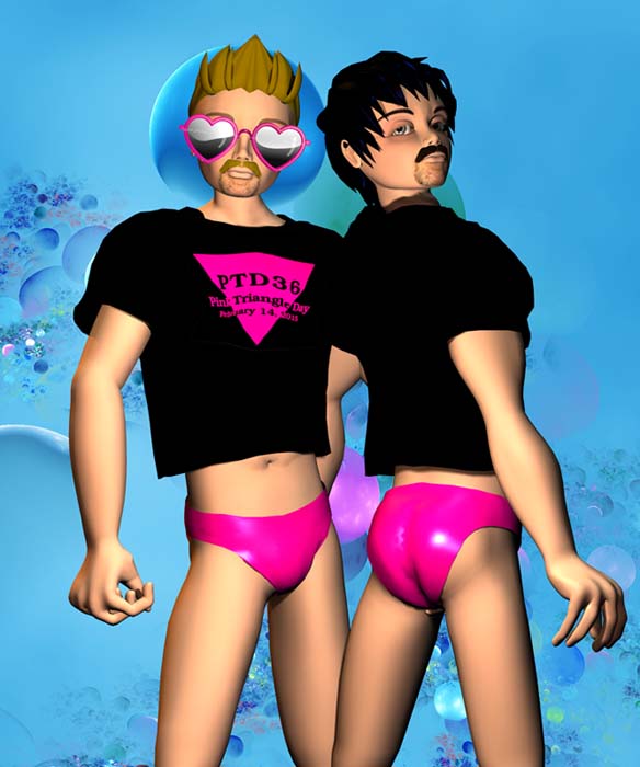 Pink Triangle Day (also known in some uncivilsed parts of the world as “Valentines Day” for reasons far too obtuse to outline) will be on us before we know it… and what better way to celebrate this glorious event than with your very own Pink Triangle Day t-shirt from the always surprising Brian Gryphon! Available in literally a rainbow of colours (so apropos!), they proudly emblazon the holiday for one and all. As Ray demonstrates, there’s naught on the back, but I think you’ll get past that, right?