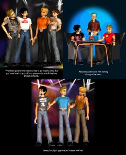 2. If you're curious, I made a slight alteration to one of the panels in this last single-panel combos, the one in the upper left. Nice thing about CG work is that it allows this kind of alteration pretty easily, and the result, I think anyway, is tighter and cleaner… and, well, funnier. And I think I may have a new character to play with: one who's upper-class and quite aware of it, thank you. I'll have to play with him a bit and see where it goes.