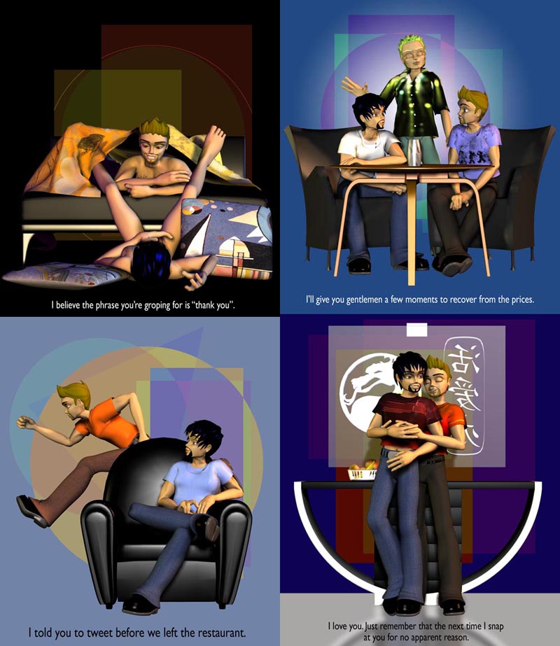With the daily panels at Pan Historia and the pretty-much-daily strips here, I’ve built up quite the collection since the blog started in January: almost 300 works, not including the wallpapers and animation tests. And it’s still as much fun to do as it was when the comic started in 1988. Hopefully, you agree.
