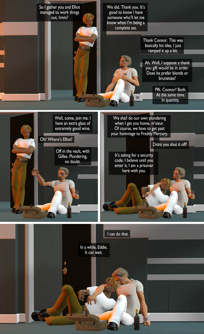 So it is, I think, with these four. Gilles and André have now both made it clear that they’re not taking any more bullshit from their respective husbands. Eddie may be a powerful financier, and Elliot a wildly successful filmmaker, but at a certain point, the attendant egos are going to be held in check… or else.