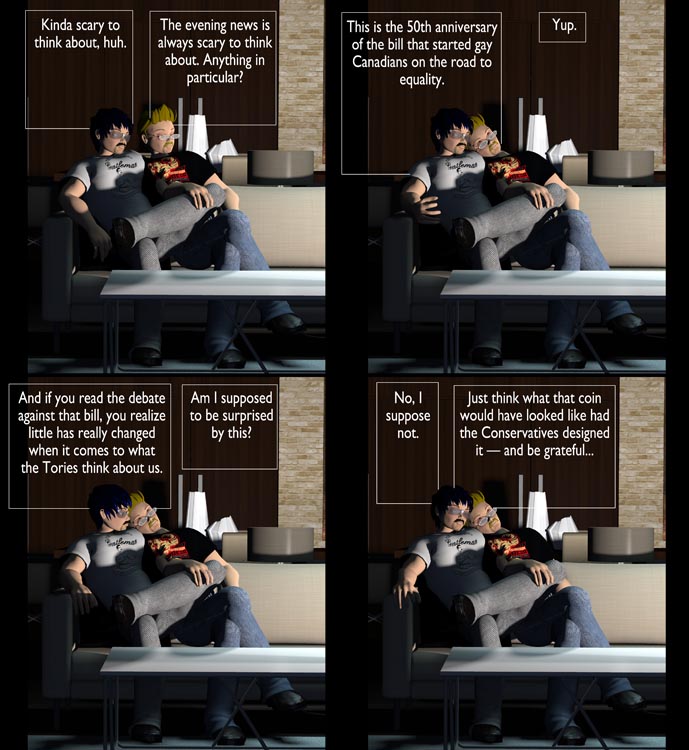 “That coin” Doc mentions is in reference to a new one issued by the Canadian mint to celebrate the 1969 passage of Bill C-150, one of the first efforts to decriminalize homosexuality (among other things) in Canada. The coin is a nice piece of work, designed by prominent gay artist Joe Average, who lives in Vancouver and whose art has been elevated to “iconic” in Canadian LGBTQ culture.