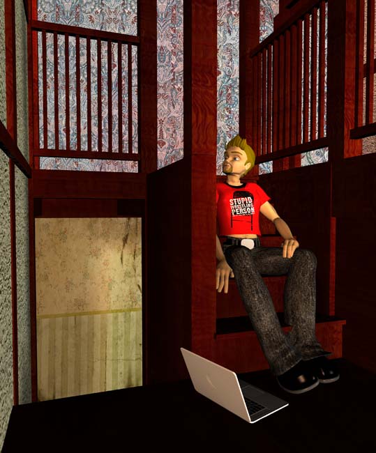 I was sitting on the landing, working on an assignment for class while Ray was off on an interview with a hardware store… and for some reason, I knew our friend was back. I dont know why I knew — the air remained the same, Tsi-boo was quietly sleeping on the bed — but somehow I knew. A subtle change in the light, perhaps. But whatever it was, he was in there.