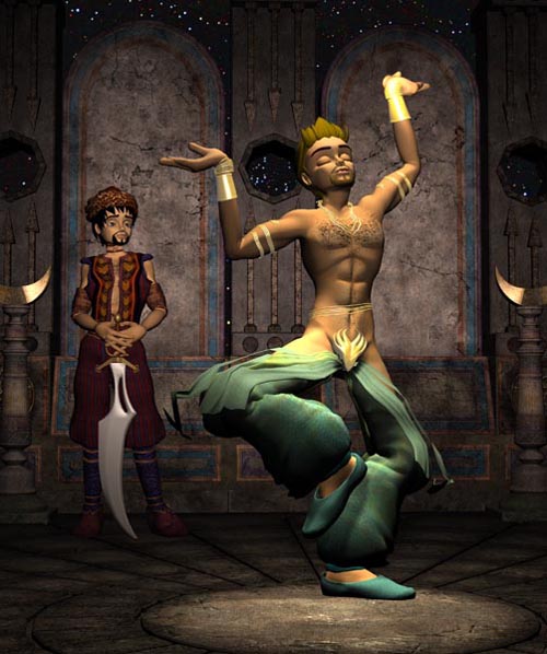 This sketch, a small fantasia on Arabian Nights themes. is a pretty decent demonstration: clothing originally designed for characer meshes called Michael and Hiro is transformed to fit DnR, thus providing… well, just all sorts of fun times. 🙂