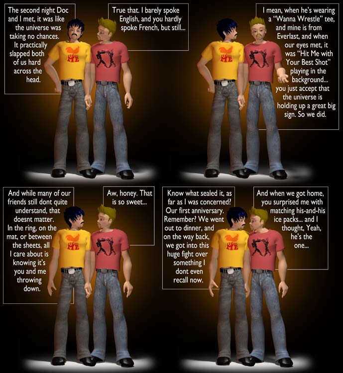 During my recent trip to NY for the Queers and Cartooning conference, I was part of a panel on “Romance in LGBTQ Comics”. While I was prepping for the presentation, I came to the rather startling realization that every grouping in this strip approached their relationship in a strange and odd way. It wasnt planned like that in the beginning, but looking over them all now, it’s almost shocking anyone in this strip got hitched, given how they started out. After all, consider: Eddie and André, a rich man and his hooker-escort boyfriend… except the hooker-escort isnt a hooker-escort, but pretends to be so his lower-class presence wont be viewed as a threat to his lover’s business dealings. Or Elliot and Gilles: an American porn producer falling for a Canadian Catholic priest. Frank and Dave: one gay, one straight, both determined that physical biology isnt going to be an issue. Then, Doc and Ray themselves — to the world, a romance that verges on heteronormality, and yet one whose level of kink outstrips almost everyone in sight (not for nothing that their wedding colours were black and blue). And let’s not even think about Aiko and Louis, whose relationship started because, at one point in time, one of them was dead. Seriously, he was.