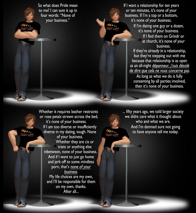 2 Pride 2019 (1) June 22, 2019 ~ docandraider With the 50th anniversary of Stonewall ramping up on us, I’m giving each of my characters their own take on what Pride means to them. Today: DnR’s Official “I’m Free with My Body but For You I’ll Charge” Connor.