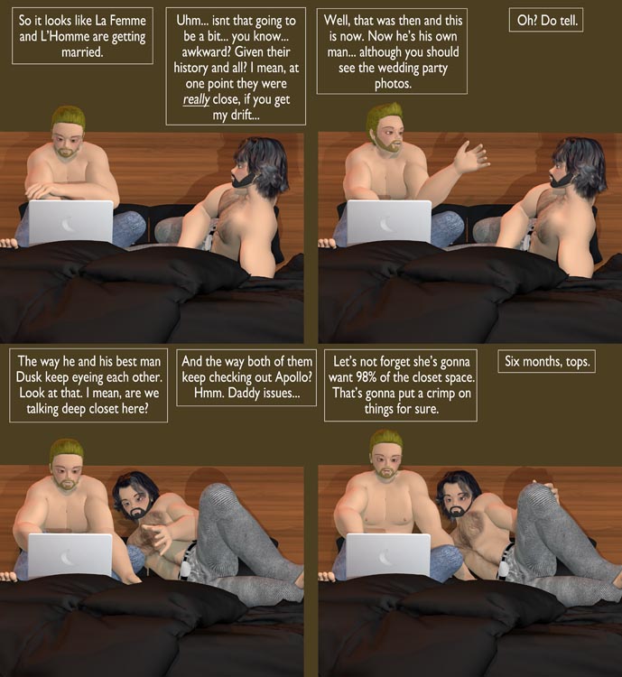 Finally, saner heads prevailed. LH was given his own reworked geometry file, which was better but still didnt address a few key issues — nevertheless, he was now “his own man”… so the marketing people decided to play off this and hold a “virtual wedding” of two character meshes who still looked enough alike to be… well, really close, if ya get my drift, to sell more stuff for LH that would finally break him out of a clothing line that was pretty much just jeans and t-shirts. I dont know how often he’ll be in that tux, but it’s a decent alternative. Still, by comparison, LF has a ton of clothing options, because that’s what sells in the 3D universe.