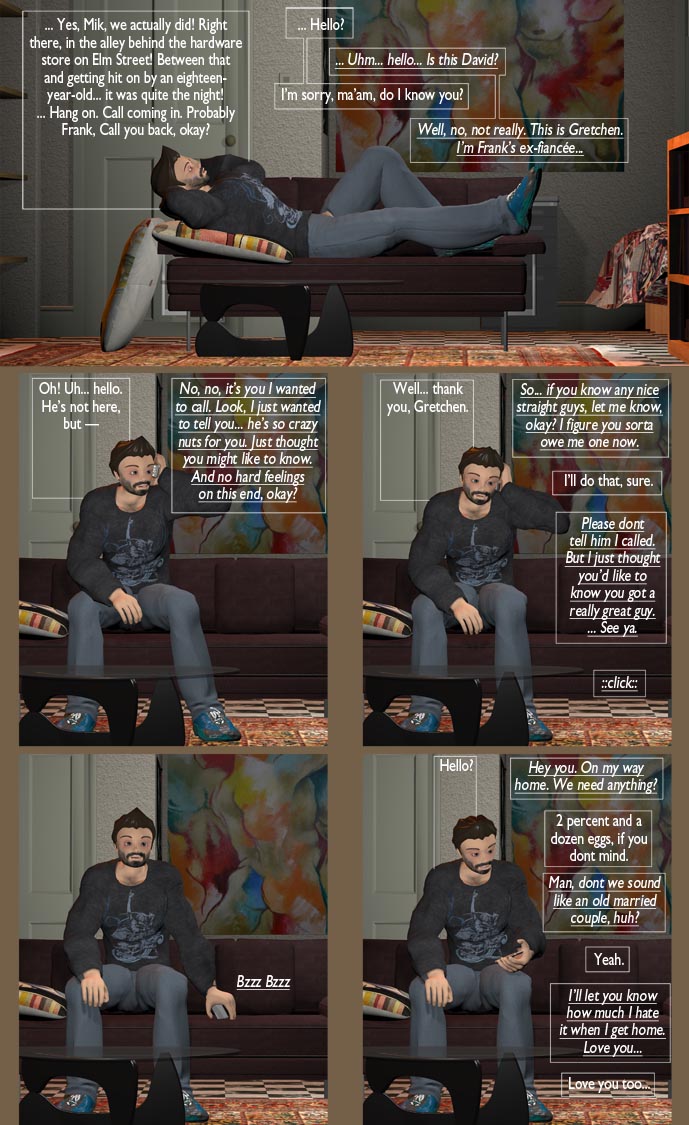 I dont know what the proper term would be for someone like Frank — pansexual, I suppose, since his sense of attraction goes beyond just men and women… or at least as much as he’s finally able to admit to. And I suppose that going into this thing with Dave may seem like just trading one closet for another, but I dont think that’s the case. Both he and Dave have some exploring to do, about themselves and each other, so we’ll be checking back in on them from time to time.